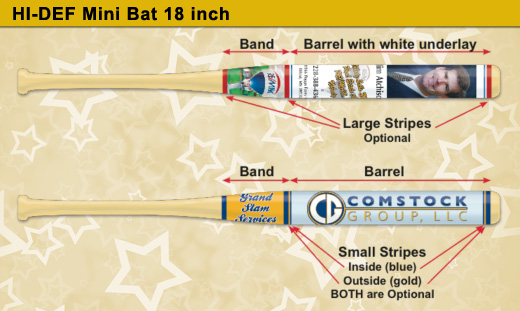 B18-IU Mini Bat has a barrel underlay of White (default), Silver, or Gold foil. Imaging can be placed on top of this coating.