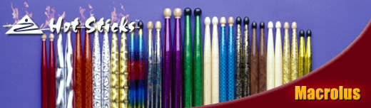 Following state-of-the-art manufacturing and rigorous inspection processes that insure an uncompromising standard of drumstick quality, Hot Sticks' Macrolus models are put through a painstaking, eleven-step process to create their intense colors, striking patterns and spectacular visual effects. The sticks are available in a wide selection of finish options that have been developed for modern drummers that want to be seen as well as heard.